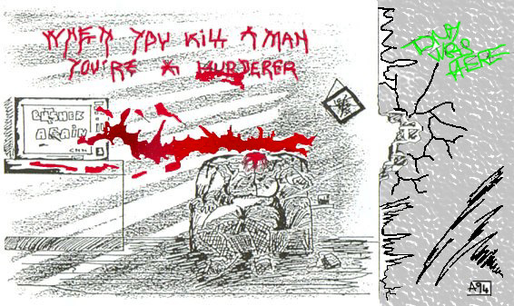Explications : L'entrepôt 45 (c'est à dire celui où le gang des Ironfists était censé s'être planqué) est grand ouvert. En fait la porte principale a été défoncée par une grande camionnette blanche aux couleurs de BIOTECHNICA, Après avoir pris d'innombrables précautions inutiles, les cops vont se décider à entrer dans l'entrepôt pour découvrir un spectacle peu ragoûtant : le gang a été entièrement décimé à l'arme automatique. L'un des membres (que les médecins légistes identifierons comme le chef) a la tête tranchée. On s'est servi de son sang pour écrire sur un mur : KILL MANY AND YOU'RE A CONQUEROR . Encore une fois les cops ne peuvent que compter les points : les six victimes formaient le gang des Ironfists. Sous la direction de Ted Brown, trente neuf ans (un individu au passé chargé), agissaient les cinq petits jeunes (dix huit à vingt quatre ans) qu'il avait recruté. Leur pain quotidien était le trafic d'armes (et parfois de stupéfiants) en provenance d'Amérique du Sud par bateau. Alors qu'ils interviennent (et s'ils ne font rien pour les en empêcher) les cops sont filmés par une équipe de NETWORK 54. Dès le lendemain ils feront la première page des journaux. Les rapports d'autopsie indiquent que les 6 membres ont été tués par des balles de 10 mm. De plus Ted Brown a été abattu avant d'être décapité. Cette opération ayant été effectuée avec une lame extrêmement aiguisée (ou alors le tueur est extrêmement fort ... ) |