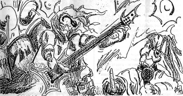 L'XTCbt Une drogue de combat obtenue par BIOTECHNICA à partir d'un dérivé d'ecstasy, (d'où son nom). Cette drogue fait gagner +3 en SF par dose prise et +2 en REF pour 8 heures. Le principal effet secondaire est que chaque dose entraîne la perte de 1D4 d'humanité et qu'à chaque utilisation il a 80+(2*nb de prises) % de chances de devenir dépendant. Les PJs ne doivent, jamais découvrir par un moyen légal la composition exacte de cette substance. Toutes leurs tentatives pour la faire analyser conduiront au même résultat : échantillons volés. détruits. trop pollués pour être exploitables ou finalement inintéressants : BIOTECHNICA a suffisamment de contacts bien placés pour empêcher qu'on fourre son nez dans ses affaires. Dans la rue. il faudra trouver un excellent chimiste pour obtenir quelques renseignements. De plus même si les persos se débarrassent du Boucher à la fin arrangez-vous pour qu'ils ne retrouvent pas cette horreur biochimique. (A moins que vous souhaitiez vous en servir pour une suite au scénario) Quelques explications sur les crimes et leur auteur : l'histoire du boucher NB : Vous trouverez sa fiche de PNJ complète ci dessous Bill Smith a été condamné il y a 20 ans à la réclusion à perpétuité pour meurtre prémédité. Il a alors juré de se venger des membres du Jury qui avaient détruit sa vie. Après quinze ans de taule. BIOTECHNICA l'a sorti de là pour l'intégrer dans un programme de recherche secret de cyber soldats. Il a donc reçu un grand nombre d'améliorations cyber alors qu'il testait dans le même temps plusieurs drogues de combat (qui ont réduit ses capacités de jugement mais pas ses facultés intellectuelles). Au début du scénario, il a réussi à s'enfuir du laboratoire de BIOTECHNICA de Night-City où il se trouvait. Il s'est débarrassé de ses gardes et a volé une camionnette. Il a ensuite entrepris de se débarrasser des membres du jury. Il signe ses crimes avec les paroles d'une chanson de Megadeth qu'il écoutait au moment de son arrestation (et qui parle justement des tribunaux et du système judiciaire) Notes complementaires sur REVEREND et les PNJs Dans ce scénario, le groupe REVEREND n'a rien à voir avec le vrai. Je me suis juste reservi du nom afin de leur donner plus de consistance dans le monde de Cyberpunk. En effet, vous pouvez vous procurer un ou deux CDs du groupe pour faire plus vrai et sonoriser la partie... Globalement, les membres du groupe se comportent comme de grands enfants pas franchement préoccupés par leur sécurité. Imaginez de rejouer le film Bodyguard en remplaçant Whitney Houston par un groupe de thrash... Voici les caracs envisagées pour les membres :